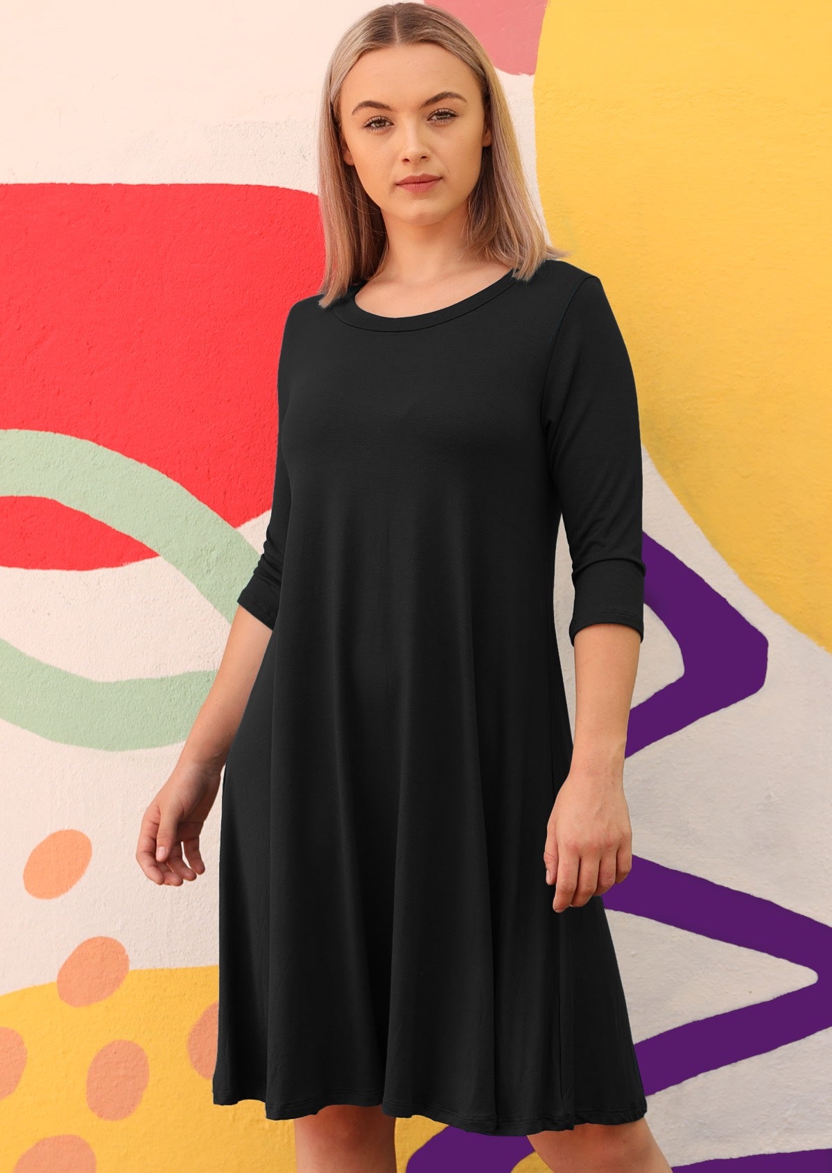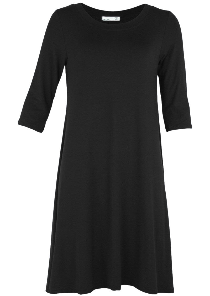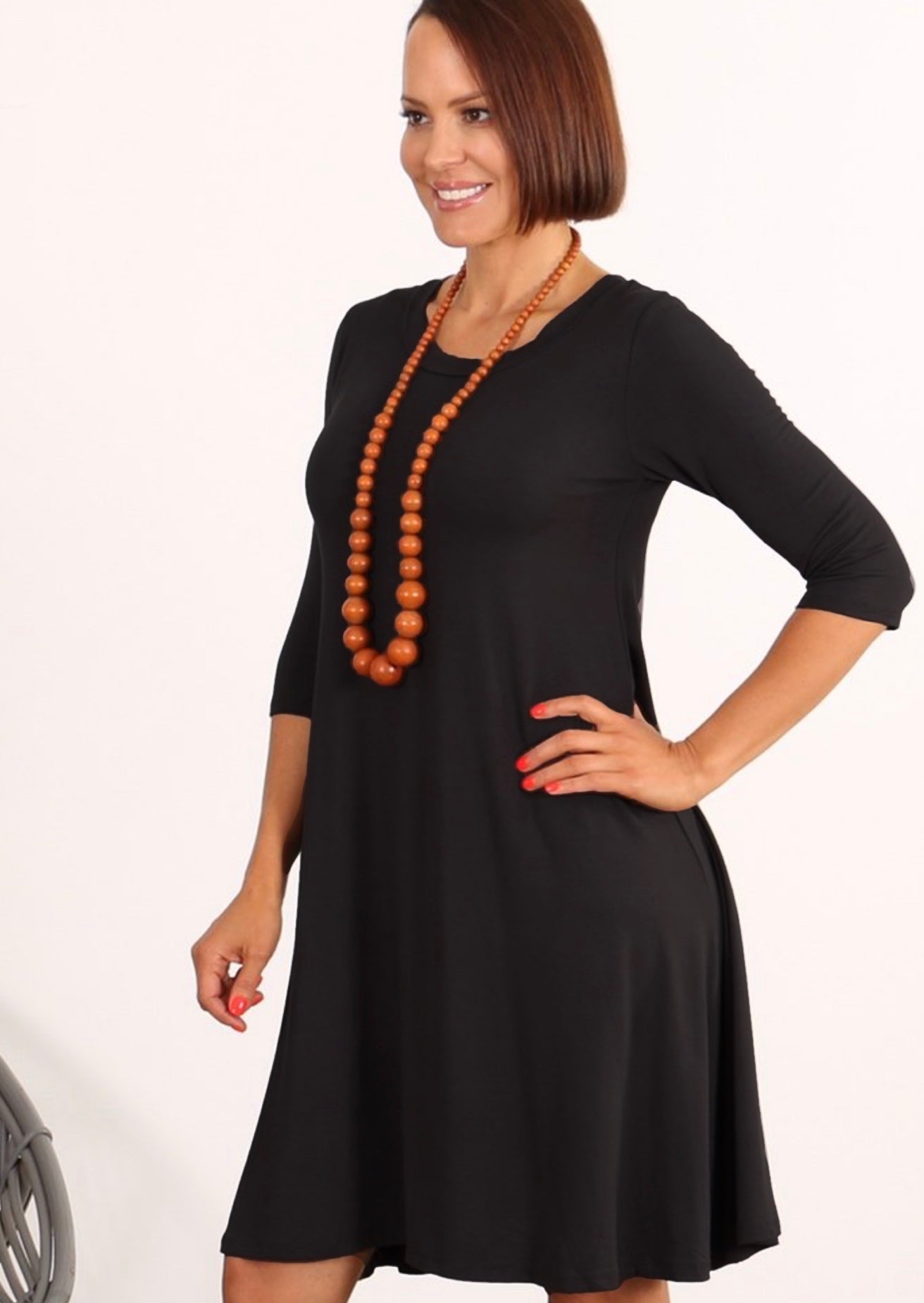 These mid sleeve black stretch jersey dress feels fabulous to wear. A flattering scoop neckline followed by a straight bodice and finished with an aline skirt. Add a belt, some wedges and a statement necklace to go to town, layer it with boots, scarves and and waistcoat for cooler days or wear it with flats and a long string of beads for a casual approach. Fits size 10-14