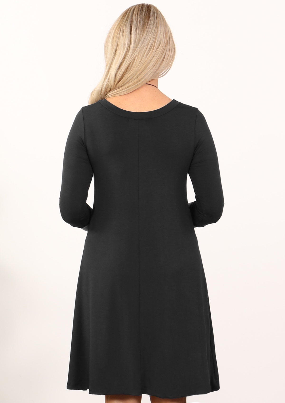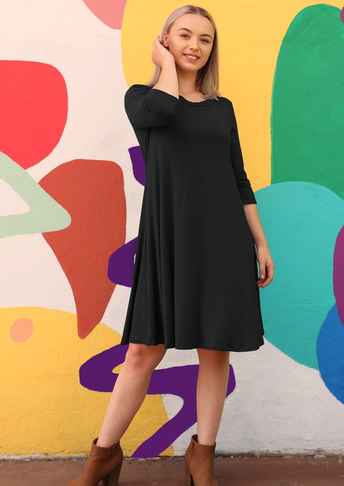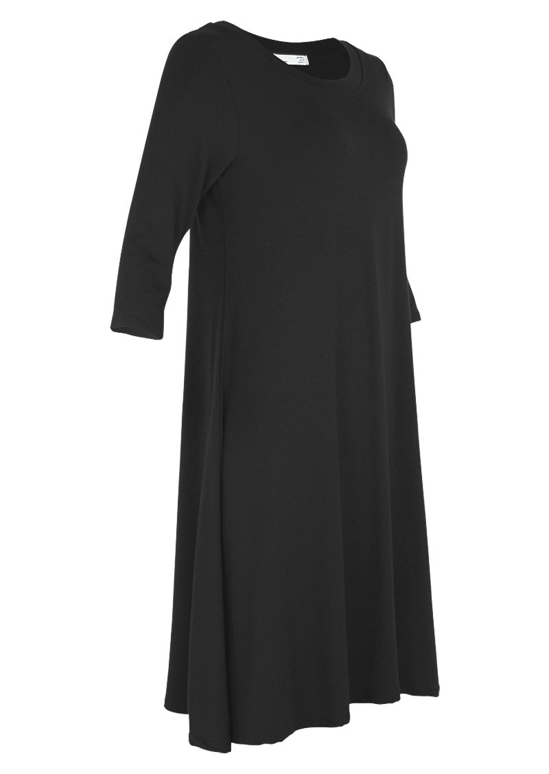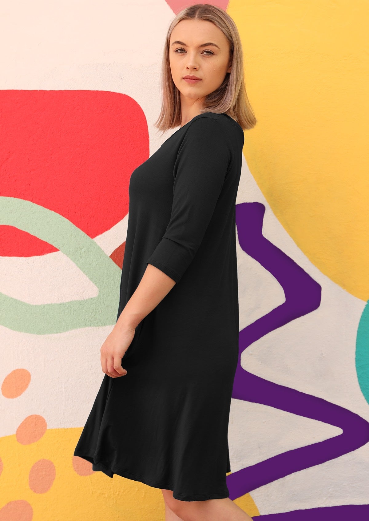 These mid sleeve black stretch jersey dress feels fabulous to wear. A flattering scoop neckline followed by a straight bodice and finished with an aline skirt. Add a belt, some wedges and a statement necklace to go to town, layer it with boots, scarves and and waistcoat for cooler days or wear it with flats and a long string of beads for a casual approach. Fits size 10-14