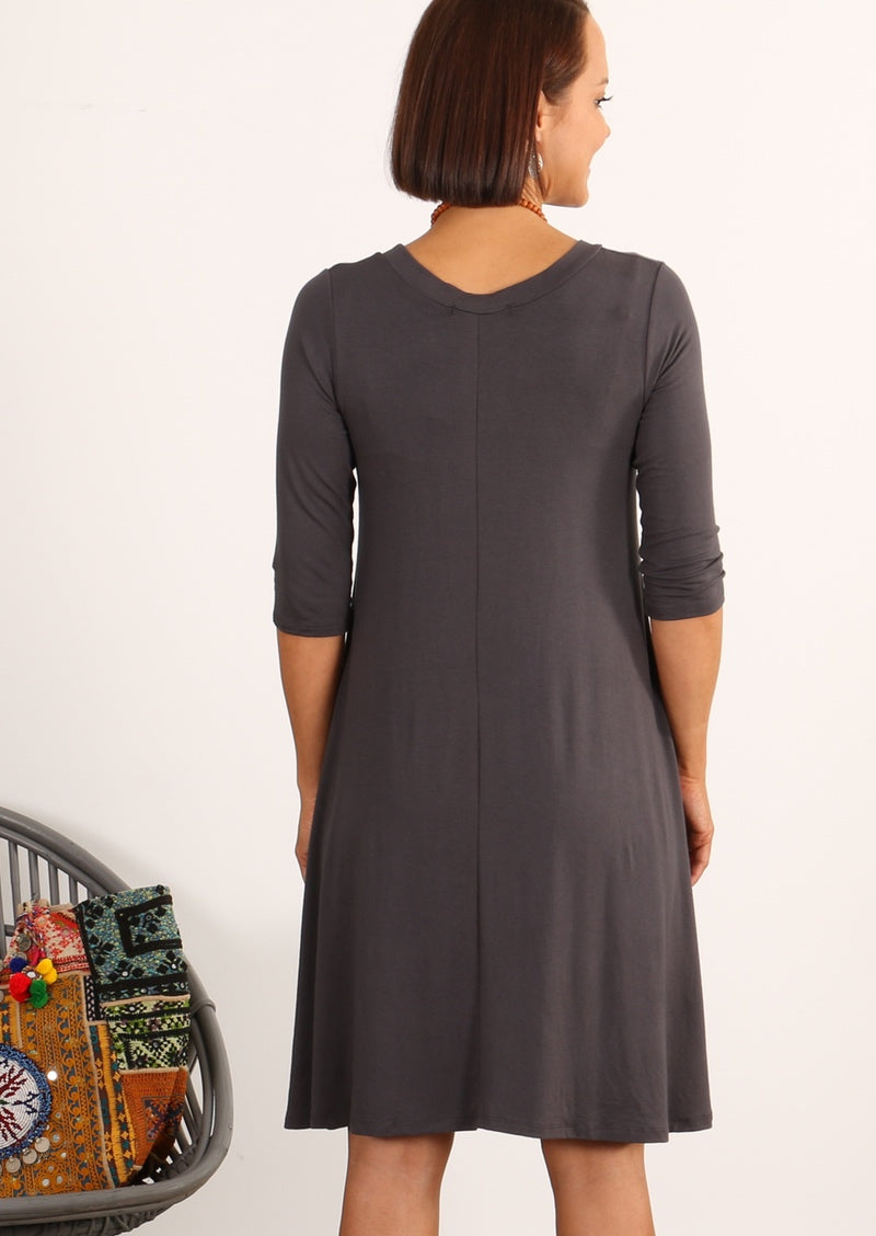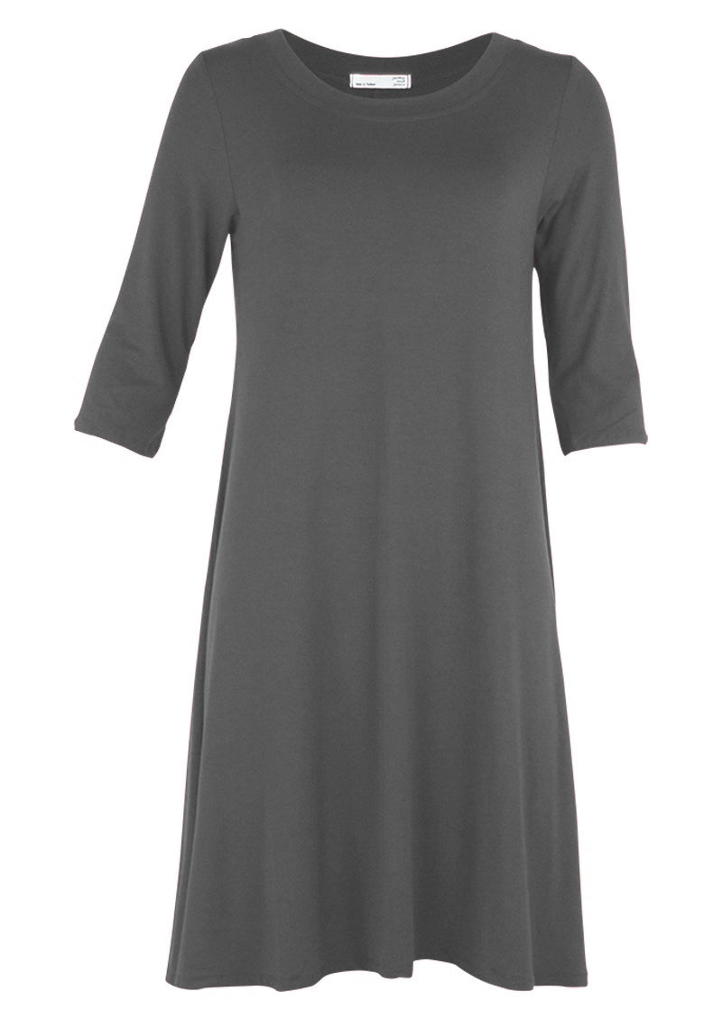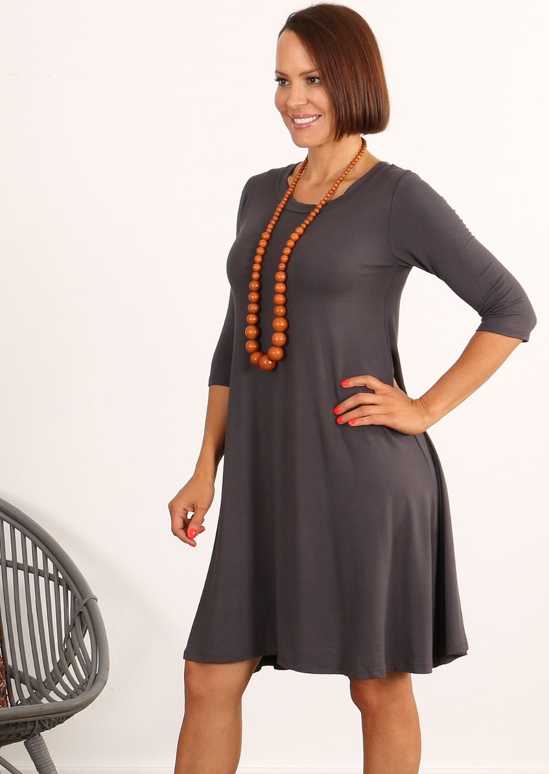This dark grey half sleeve jersey dress provides a fabulous and elegant fit. A flattering scoop neckline followed by a straight bodice and finished with an aline skirt. Add a belt, some wedges and a statement necklace to go to town, layer it with boots, scarves and and waistcoat for cooler days or wear it with flats and a long string of beads for a casual approach.