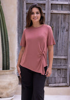A short-sleeve, crew-neck top made from soft, stretch rayon jersey, designed for everyday comfort, featured in versatile dusty rose pink. The top features a subtle twist knot detail on one side, creating a softly draped effect that adds shape and interest to the otherwise classic silhouette. The hemline is slightly asymmetrical at the front due to the gathered twist, making it a versatile piece for both casual and smart-casual styling.