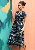 Vivien is a 50's style 100% cotton dress, now in a floral print with pops of green and soft red on a navy base. This button through dress has a mandarin collar, that can be tucked in to form a V-neck. Also has removable waist tie, hidden side pockets and pleats at the waist in the centre, front and back panel adding some stunning detail to the dress. Perfect for every occasion, add a jacket in the colder months.