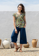 The Tulsi Top in Aspen is a sweet cap sleeve top made from 100% cotton, featured in a moss green base with multi-coloured folk art style florals. With a flattering U-shaped neckline highlighted by delicate decorative pleats, this top offers timeless style with a touch of charm. The cap sleeves provide gentle shoulder coverage, while a small elastic trim allows for ease of movement and added comfort. Worn here with our Tenzin Pants Gibraltar Blue