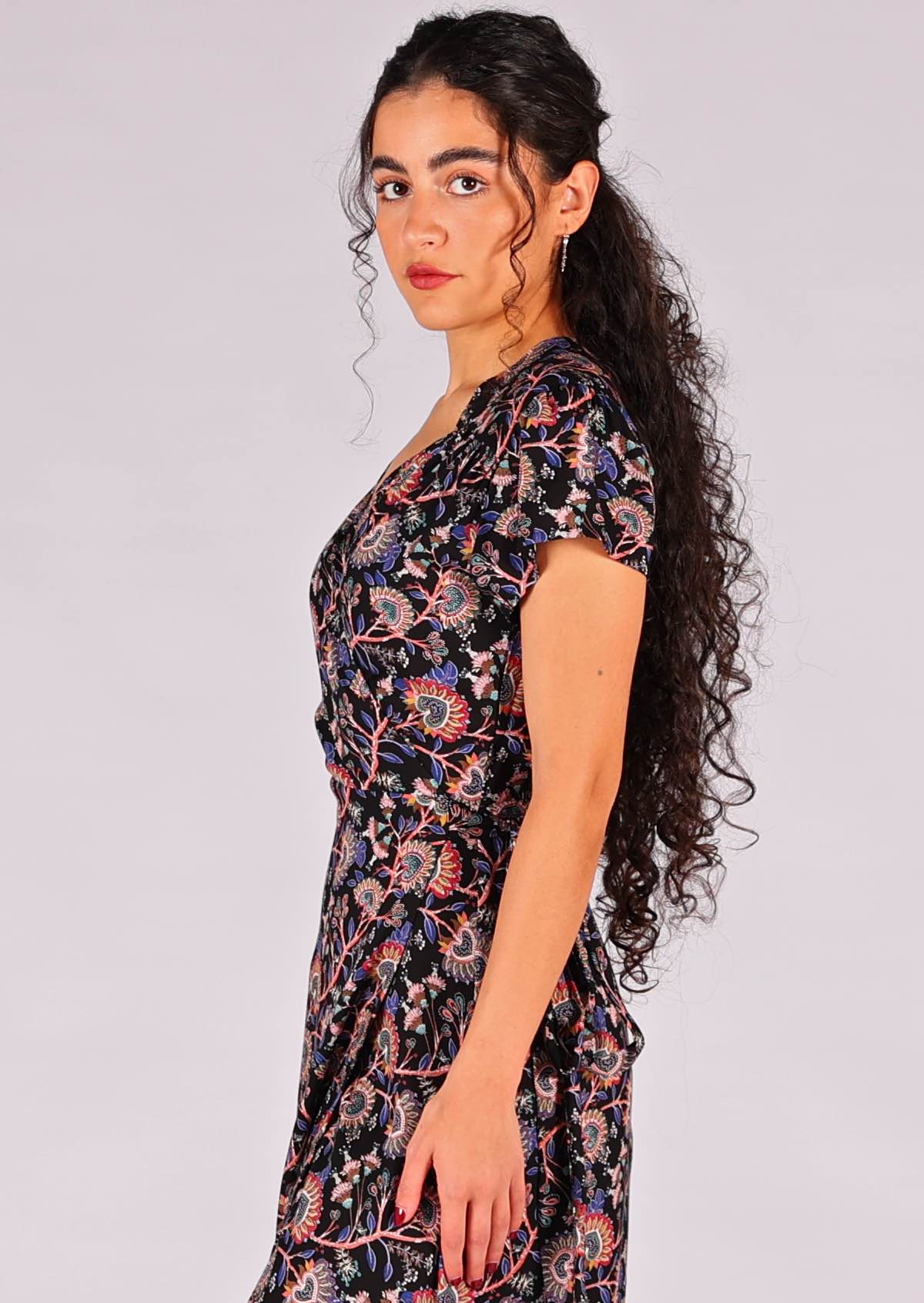 Vivien is her name, don’t forget it! Our most popular retro style dress to date. Featuring cap sleeves and hidden side pockets, this button through dress has a mandarin collar that can be folded in to make a V-neck. The skirt has volume which looks glamorous when cinched at the waist with the fabric tie, or a belt. Choose from a multitude of gorgeous prints.