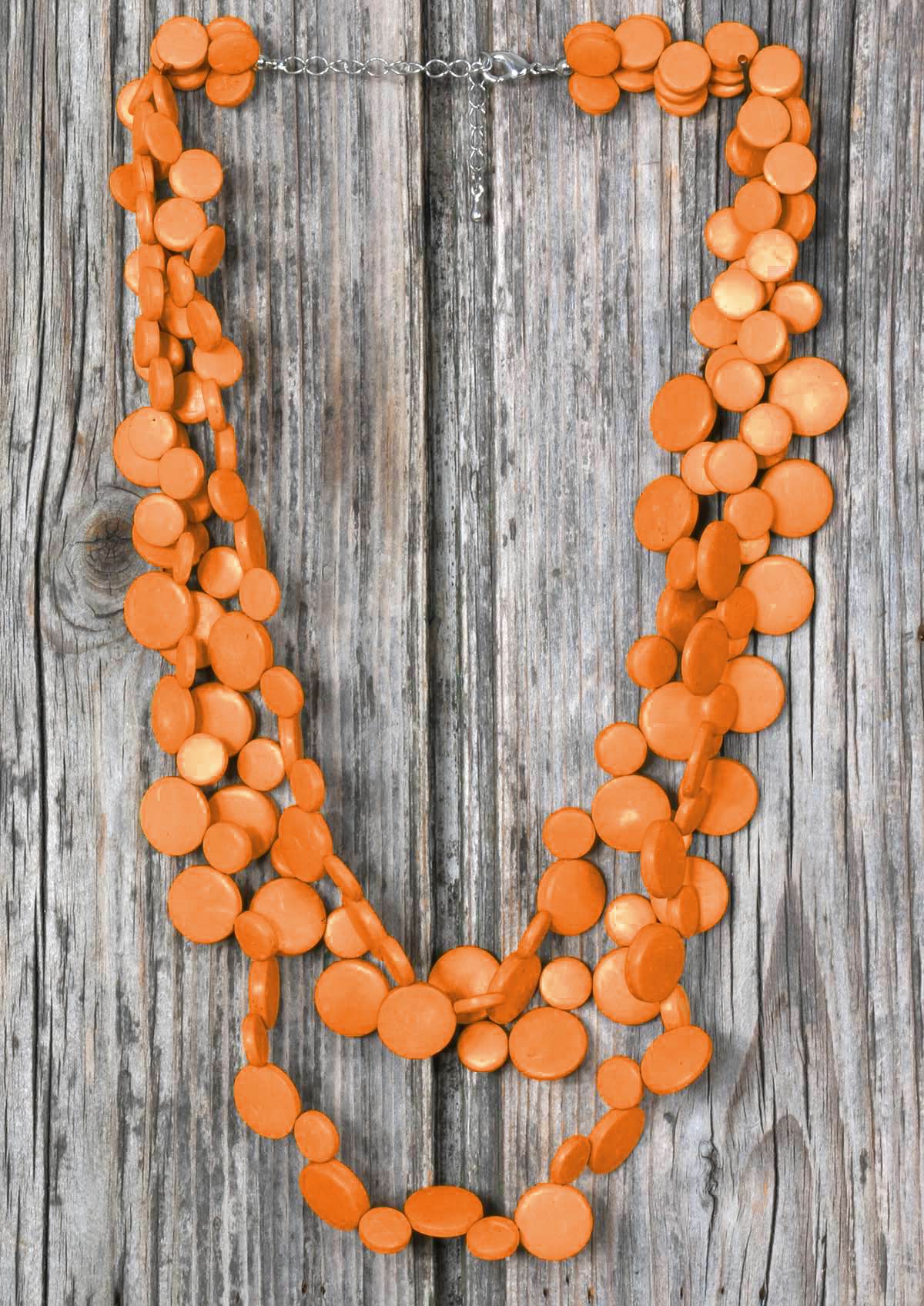 Introducing the Smarties Three Strand Necklace in Orange. This adjustable and short necklace is a statement piece that will add a pop of colour to any outfit. The perfect addition to your wardrobe for a touch of elegance and sophistication. This beautiful fair trade necklace is handcrafted with natural coconut shell with an adjustable length between 48-55cm.
