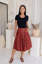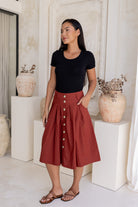 Say hello to your new everyday essential - the Ruby Skirt now available in beautiful Burnt Henna shade. The perfect knee length, 100% cotton skirt, that looks amazing and feels so comfortable. Featuring box pleats under the waistband, to give the skirt a gorgeous fit and flare, this skirt buttons through the centre, and has deep pockets. The waistband has elastic in the centre to give a great fit, also includes belt loops so you can add a belt for style. Team with boots and a long sleeve top, or sandals and a T-shirt for warmer days.