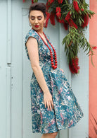 The Alice dress, crafted from 100% cotton, comes in Verdure - a field of delicate wildflowers in greens, beige, white, pink, lemon yellow and coral on a teal base. The dress channels retro charm with its flattering crossover bodice, elegant V-neckline, and classic cap sleeves Designed for comfort and style, it features a centre-back zip and practical pockets. The skirt is fuller than our other dresses, flares gently from the waist, skimming the tummy and gracefully falling to just over the knee. Pair Alice with flats or heals; it is perfect for the classroom, picnics, parties, anything! Alice is a more fitted and structured style than many of our dresses. We suggest checking the garment measurements chart to find your best fit.