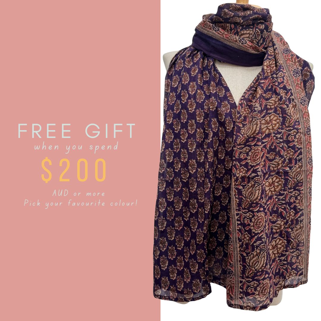 Receive this beautiful hand-printed cotton scarf free with orders over $200 AUD during our Black Friday Sale.