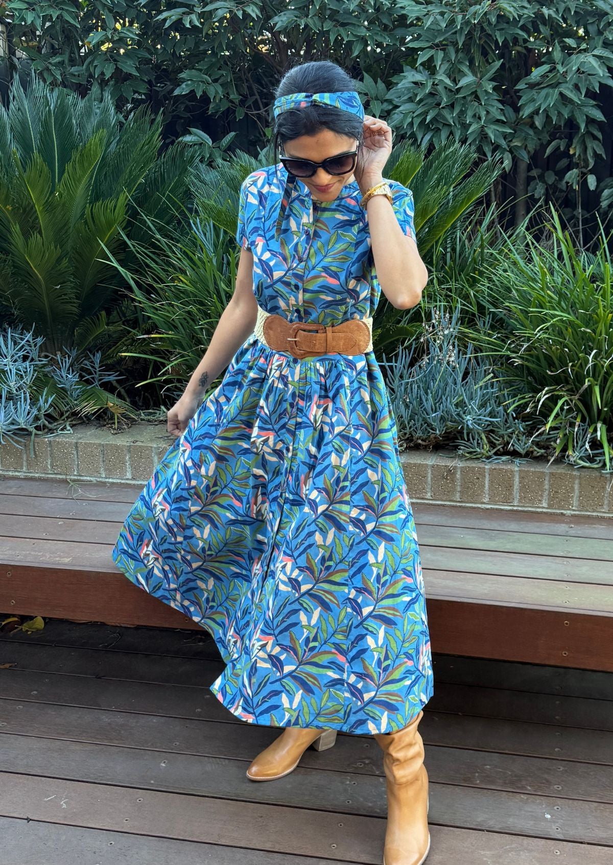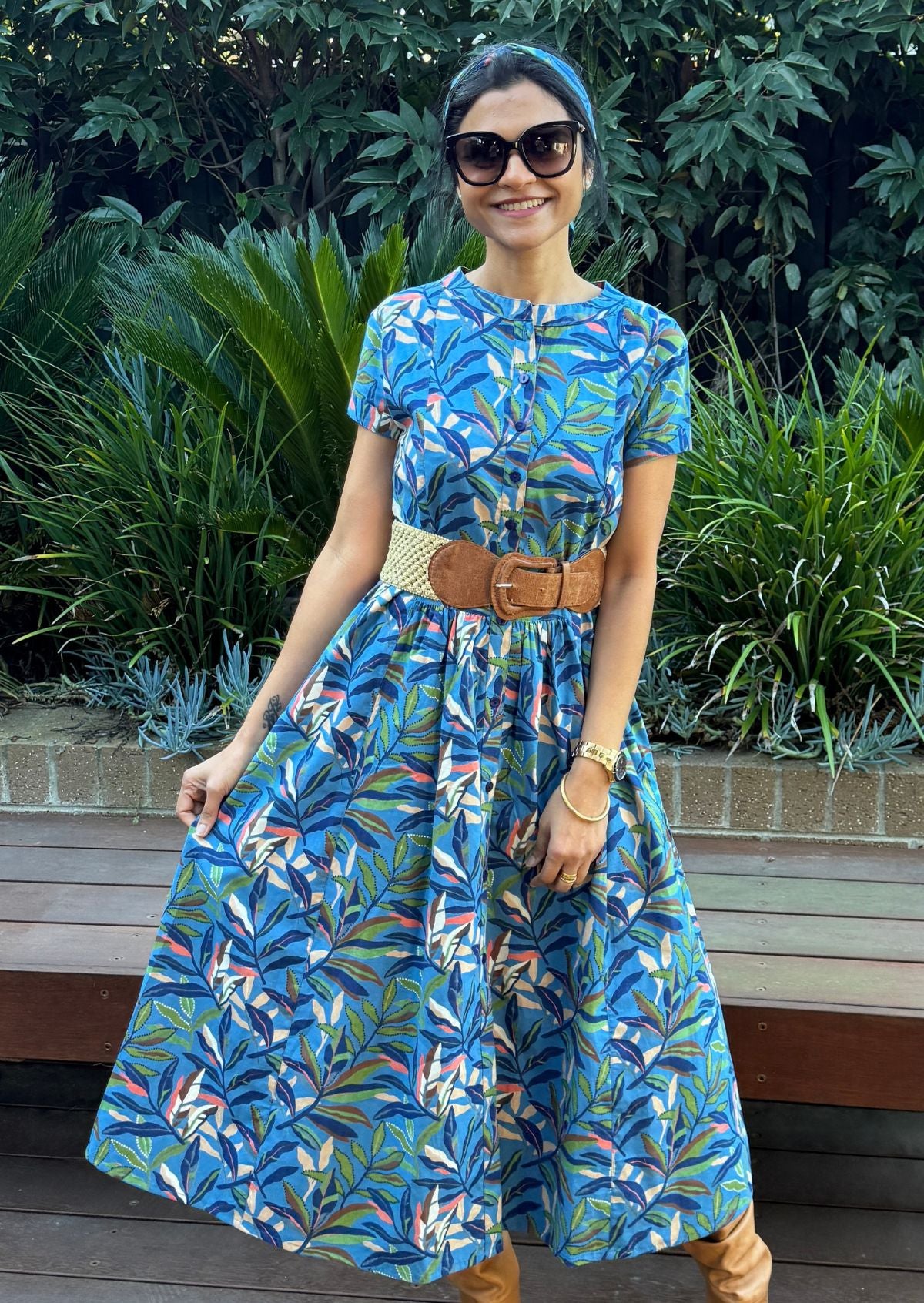 Vivien Dress Breeze is an elegant 50's style dress, in the sweet multicoloured leafy print on a blue base. A gorgeous piece throughout the day and into the night. This 100% cotton, button through dress features a high round neckline which can be tucked in to form a V-neck, hidden side pockets, and pleats at the waist in the centre, front and back panel adding some stunning detail to the dress. Wear it loose, or cinch the waist with the detachable waist tie, or try a belt. Paired perfectly with sandals or dress the look up with heels and some jewellery.
